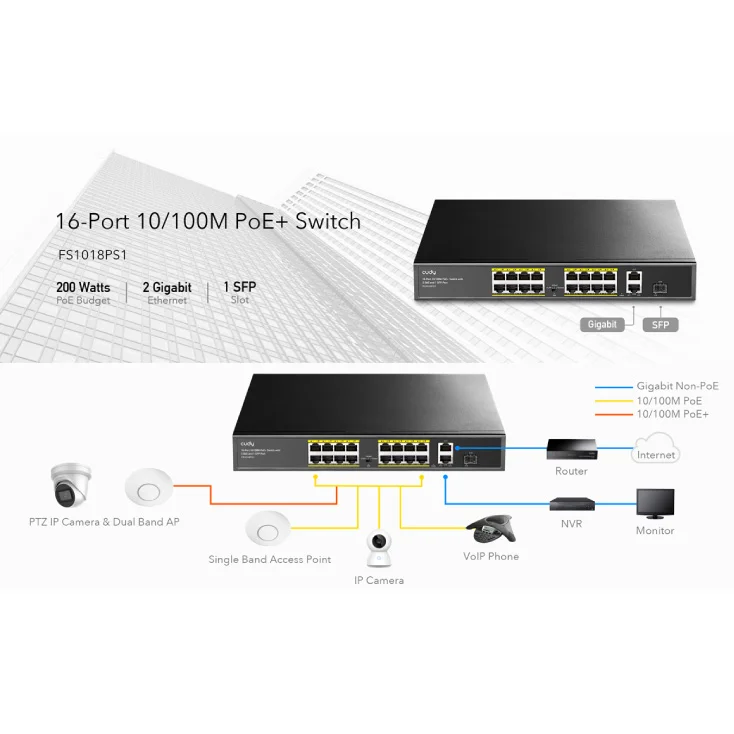 FS1018PS1 je 16-portni 10/100M PoE svič sa 1 kombinovanim SFP portom, dizajniran za sisteme video nadzora i Ethernet mreža