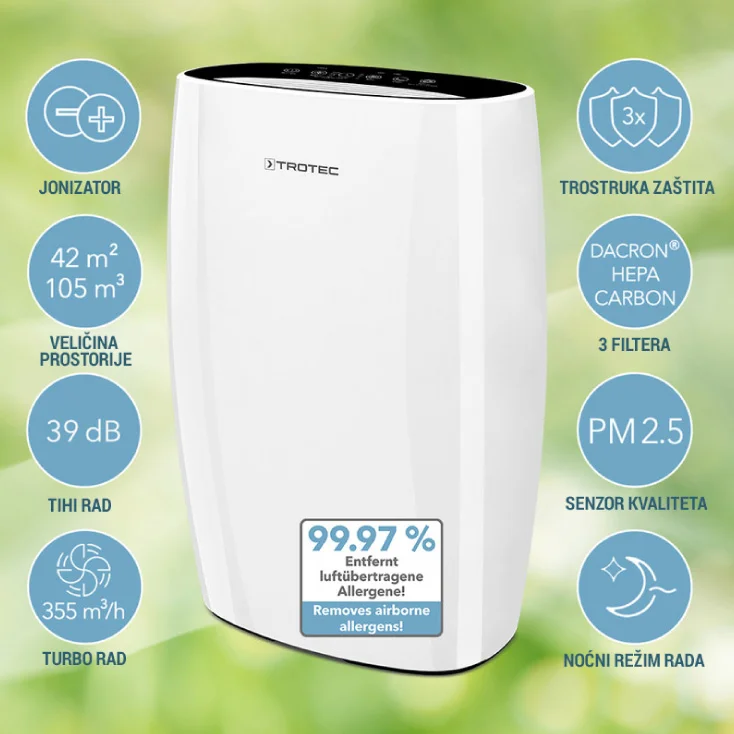Pored svojih visoko efikasnih performansi 3-u-1 HEPA filtera i tri režima rada, nudi ubedljivu komfornu opremu koju ćete naći samo u prečistačima vazduha serije AirgoClean u ovoj klasi uređaja