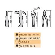 Sastoji se od 4 alata (odvijač sa izmenjivim nastavcima - 20 kom., podesiv ključ, čekić i kombinovana klešta)