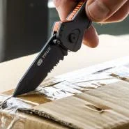 Takođe ima linijsku bravu - ugrađeni opružni mehanizam za zaključavanje koji drži oštricu sigurno fiksiranom tokom upotrebe i jarko narandžaste detalje koji nož čine vidiljivim za pronalaženje kada zatreba