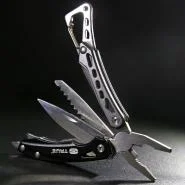Pored kvalitetnog sečiva poseduje i kombinovana klešta od nerđajućeg čelika, sečice, krstasti šrafciger, otvarač za flaše, malu testeru, pljosnati šrafciger, karabiner i turpiju