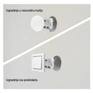 Kompaktna dimenzija (40x40x18mm) omogućava ugradnju u postojeću razvodnu kutiju ili u kutiju samog zidnog prekidača (pod uslovom da je nulti provodnik sproveden u dozni)