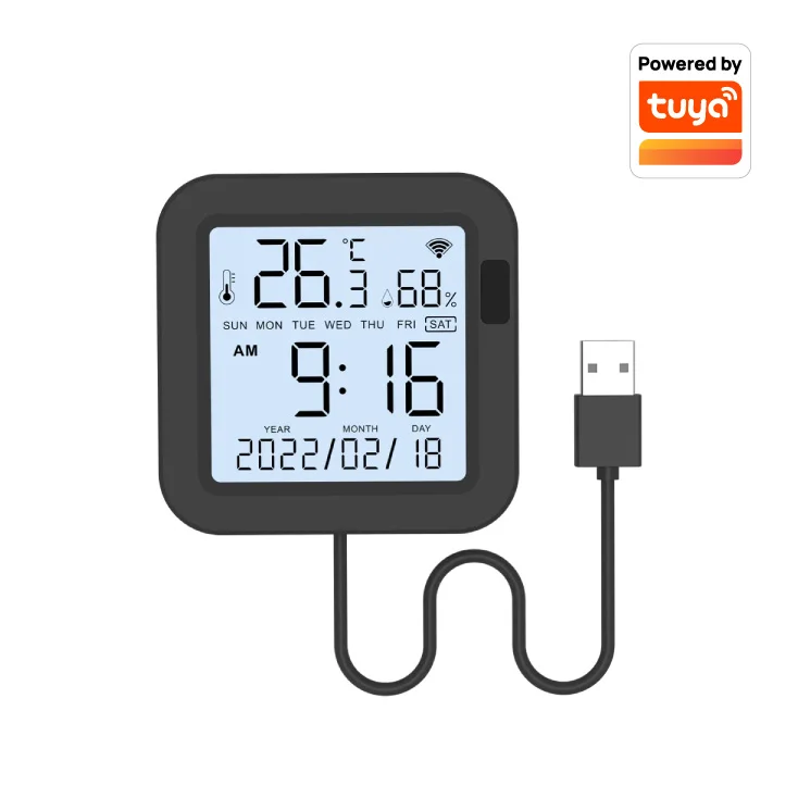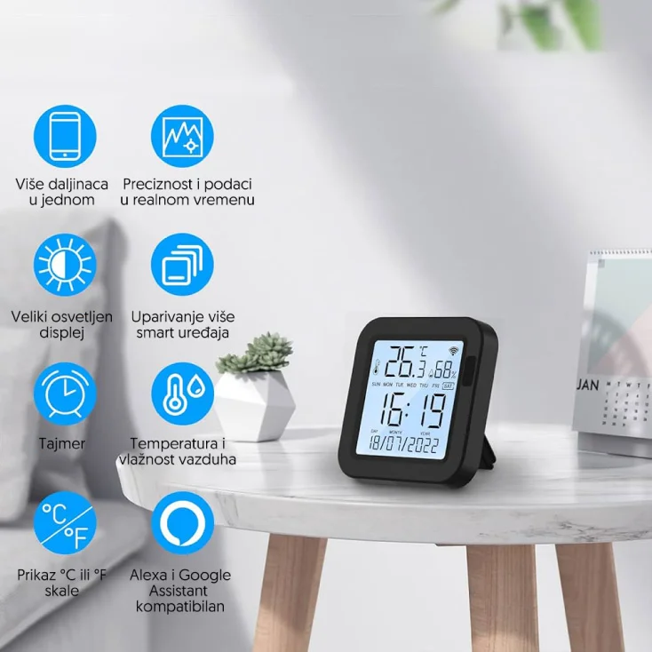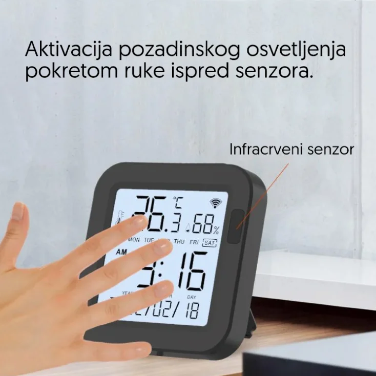Na displeju uređaja možete da vidite temperaturu, vlažnost vazduha, vreme, datum i dan nedelji